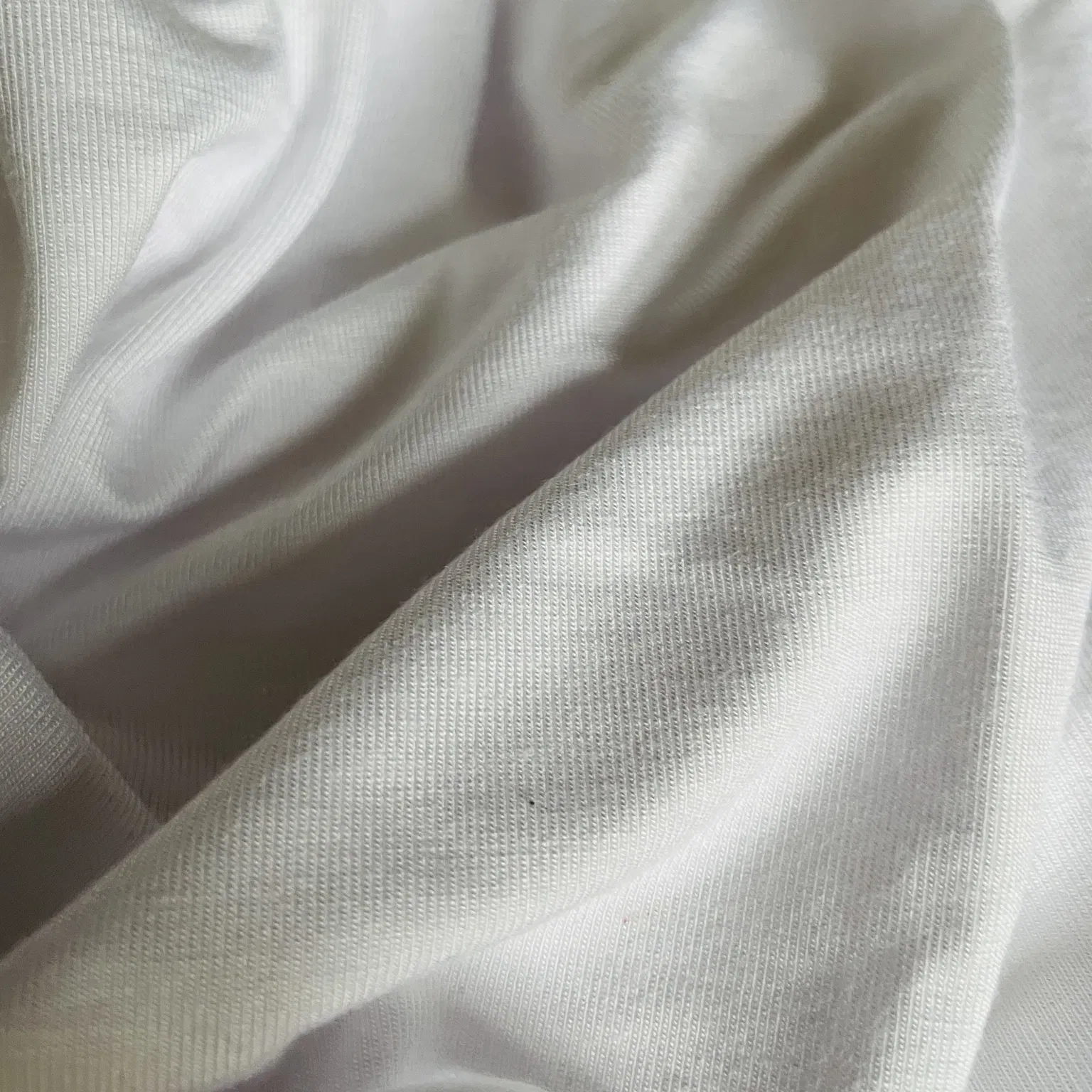 Deze stof is heerlijk zacht en soepel, met een lichte stretch. Ze voelt comfortabel aan op de huid en is heel prettig om mee te werken. Ook voor ecoprinten is bamboe jersey een fijne basis, omdat de stof goed kleur opneemt en mooi meebeweegt.