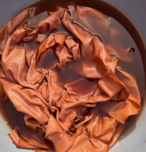 Tijdens het stomen van je ecoprintbundel gebeurt er iets bijzonders. De tannine uit het cutchlaken ontmoet het ijzer in je bundel.