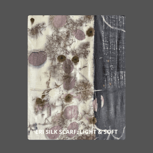 Eri Silk heeft uitstekende absorberende eigenschappen. Bij het ecoprinten vangt het de essentie van kleuren, bladeren en zelfs bloemen, waardoor de sjaal kan schitteren in de meest levendige tinten.