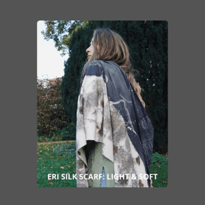 Eri Zijde Sjaal: Licht & Zacht doet zijn naam eer aan, en is verfijnder geweven dan de Eri Zijde Sjaal: Ruw en Zacht. Toch zul je ook bij deze sjaal onregelmatigheden in het garen ontdekken, met dikker en dunner geweven stukken.