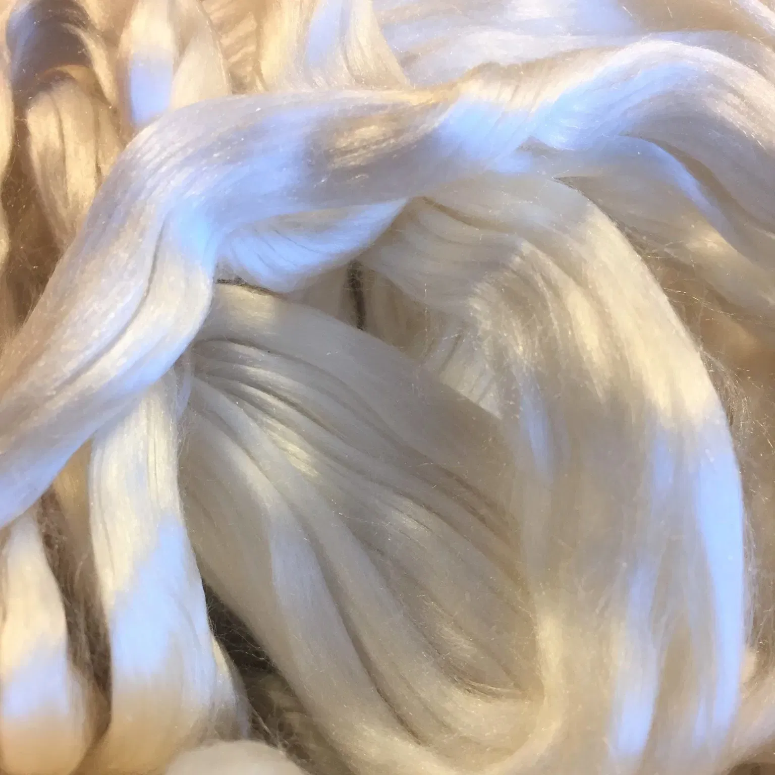De vezels voelen glad aan en hebben een natuurlijke glans die het licht vangt. Dat maakt deze zijdevezel zo bijzonder bij vilten, verven, ecoprint en spinnen.
