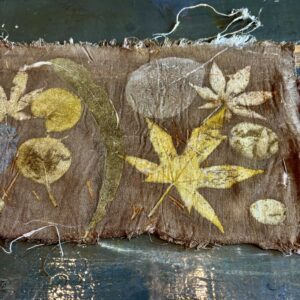 Op de afbeelding zie je een acacia tanninelaken dat in de ecoprintbundel wordt gebruikt en tijdens het stomen zijn kleur overdraagt aan het textiel.